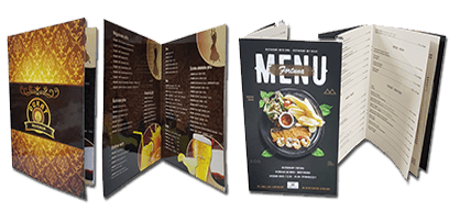 - Za brze hrane (fast food) ili kafić preporučujemo da to bude broširani plastificiran meni mekog poveza, zaheftan i nekoliko unutrašnih strana u zavisnosti koliko artikala imate u ponudi.